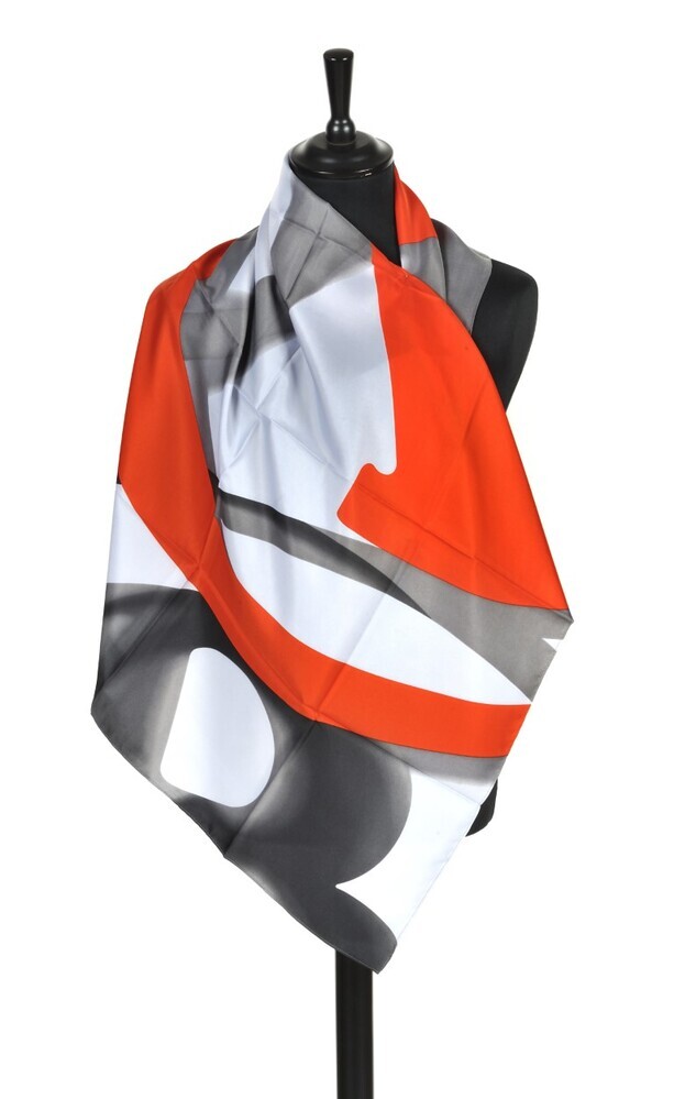 BeschrijvingWitte halsdoek met grote overlappende NMBS-logo's in oranje en verschillende tinten grijs.