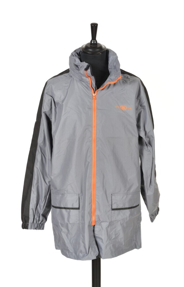 Deze grijze zomerparka voor mannen heeft verschillende zakken. Ze is afgewerkt met zwarte strepen op de mouwen, een oranje ritssluiting en oranje opschriften. Het NMBS-logo is aangebracht op de linkerborst en op de rug. De jas heeft een uitneembare regenkap.