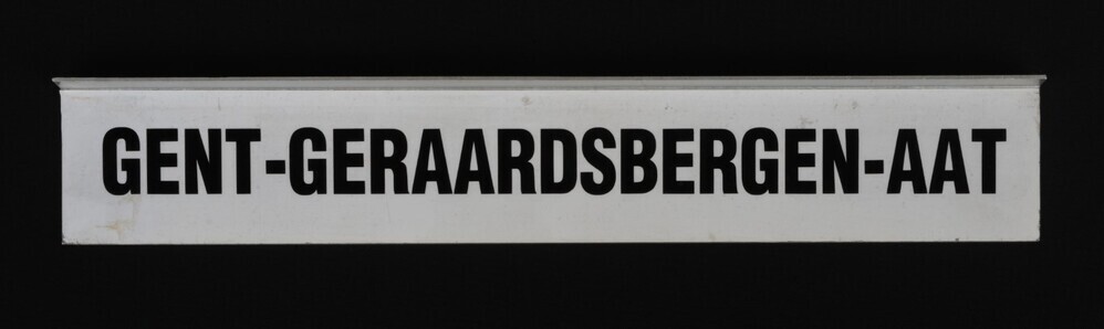 BeschrijvingAluminium bordje met zwarte letters. Het bord werd in een treinaankondiger geschoven om treinen van Gent richting Aat via Geraardsbergen aan te kondigen.