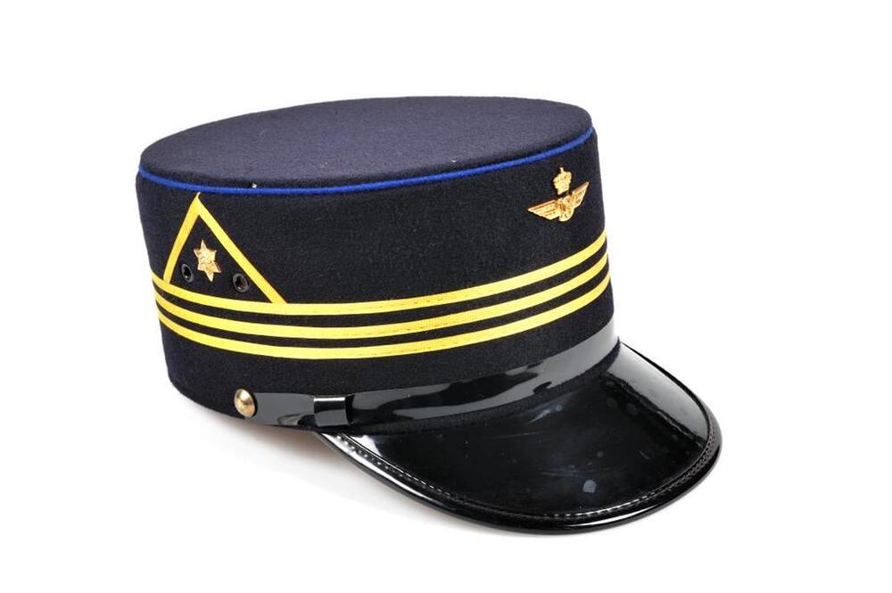 Zwarte kepie met zwarte klep in kunststof. De stormband is van kunststof en vastgemaakt met twee goudkleurige knopen. Er lopen drie gele biezen, op ca 3 cm, 4 cm en 5 cm van de rand. De naadbies is blauw. Aan beide zijkanten loopt een gele bies in driehoeksvorm met daarin een gouden ster. Vooraan is een spoorweginsigne bevestigd. De kepie is verstevigd met een leren band en de voering is rood.