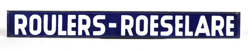 BeschrijvingBlauw bordje met witte letters. Werd aan een treinaankondiger gehangen om treinen richting Roeselare aan te kondigen.