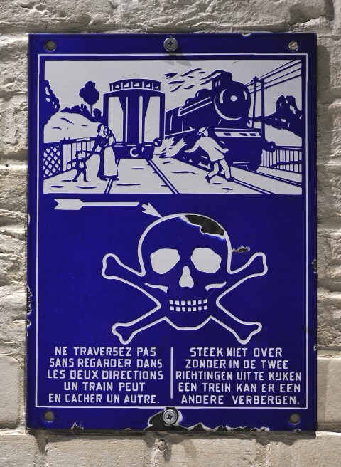 Blauw bord met witte letters. Boven het opschrift staan afbeeldingen van een doodshoofd en een familie die de sporen probeert over te steken terwijl er een stoomlocomotief voorbijraast.