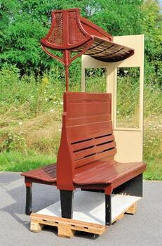 BeschrijvingDeze zitbank biedt plaats aan zes personen. Bovenaan bevindt zich een bagagerek. De treinbank heeft drie poten aan de gangzijde. Langs de andere kant werd de bank aan de wand van het rijtuig vastgemaakt.