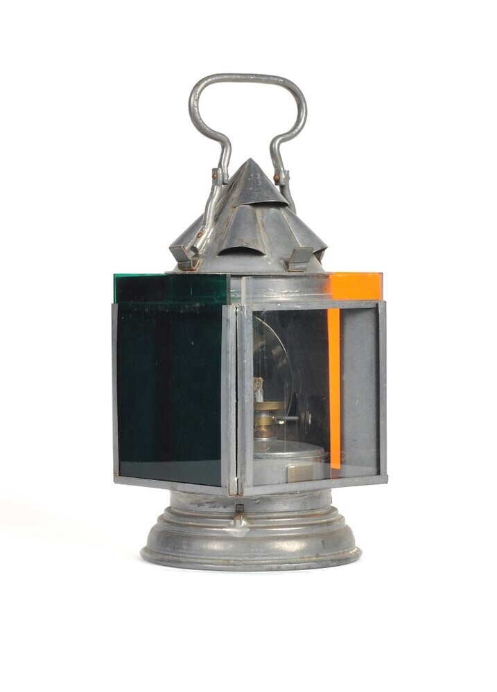 In geval van nood of bij een defect sein kon men met een handsein een waarschuwing geven aan de treinbestuurders. 's Nachts deed men dit door de trein tegemoet te lopen, zwaaiend met een seinlantaarn. Deze metalen lantaarn heeft vier glazen zijden die kunnen worden vervangen door gekleurde glasplaatjes: wit (om de uitvoering van bepaalde bewegingen te bevestigen), groen (om doorrijden toe te laten tegen de normale snelheid), geel (om doorrijden toe te laten, maar wel tegen een verminderde snelheid) of rood (om de trein onmiddellijk te laten stoppen). De lantaarn staat op een ronde voet, is bovenaan kegelvormig en heeft een klein handvat. Schenking van Johan Verhoeven.