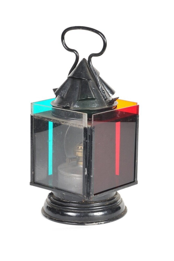 In geval van nood of bij een defect sein kon men met een handsein een waarschuwing geven aan de treinbestuurders. 's Nachts deed men dit door de trein tegemoet te lopen, zwaaiend met een seinlantaarn. Deze lantaarn heeft vier glazen zijden in verschillende kleuren: wit (om de uitvoering van bepaalde bewegingen te bevestigen), groen (om doorrijden toe te laten tegen de normale snelheid), geel (om doorrijden toe te laten, maar wel tegen een verminderde snelheid) of rood (om de trein onmiddellijk te laten stoppen). De lantaarn staat op een ronde voet en heeft een handvat bovenaan. Schenking van Johan Verhoeven.