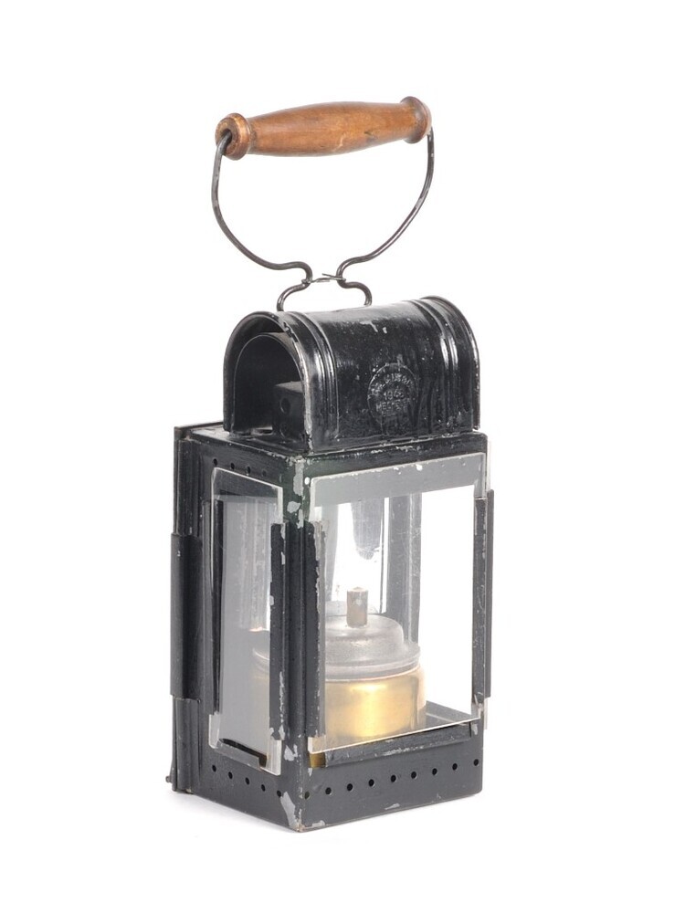 BeschrijvingDeze vierkante carbidlantaarn heeft drie glazen zijden. De voorste zijde kon vervangen worden door een glasplaatje in een kleur naar keuze. De lantaarn is geplaatst op een voet die diende als reservoir.