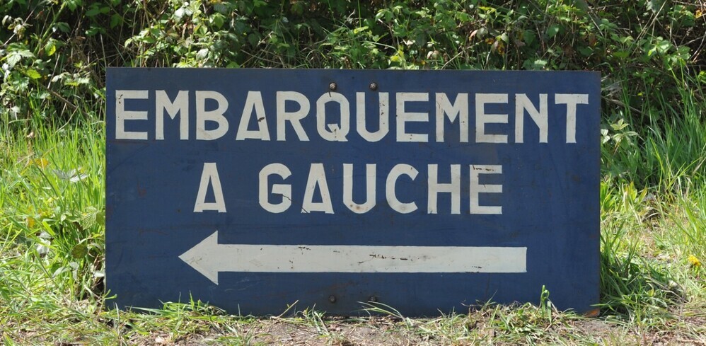 BeschrijvingBlauw bord met wit opschrift 'Embarquement à gauche' en witte pijl naar links.