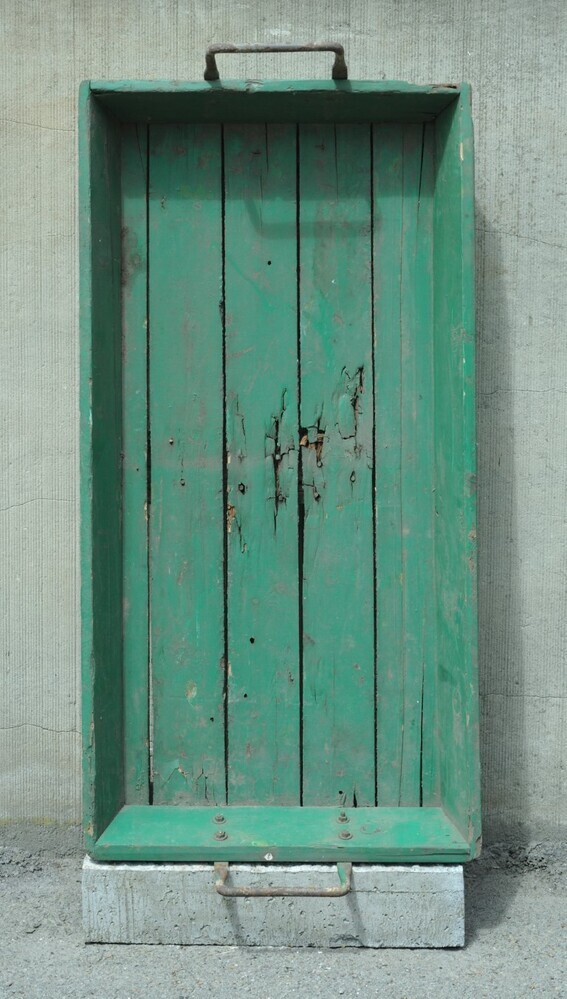 BeschrijvingGroene houten bak met metalen handvaten voor onder meer het verzamelen van lasbouten voor raillassen en schroefbouten voor het bevestigen van de rails op de dwarsliggers. Deze bak werd gebruikt tijdens werken aan het spoor.
