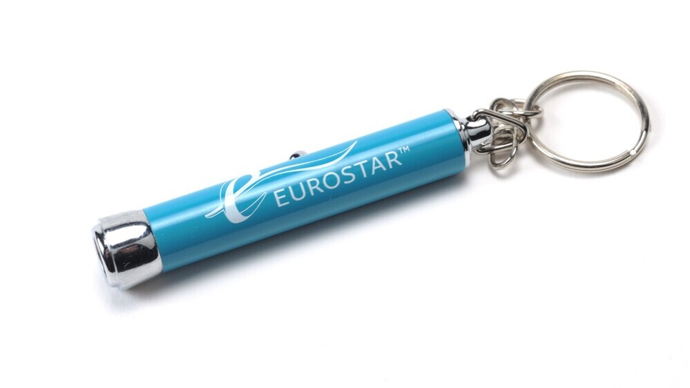 BeschrijvingBlauwe sleutelhanger met ingebouwd pillicht. Op de zijkant staat het logo van Eurostar in wit.