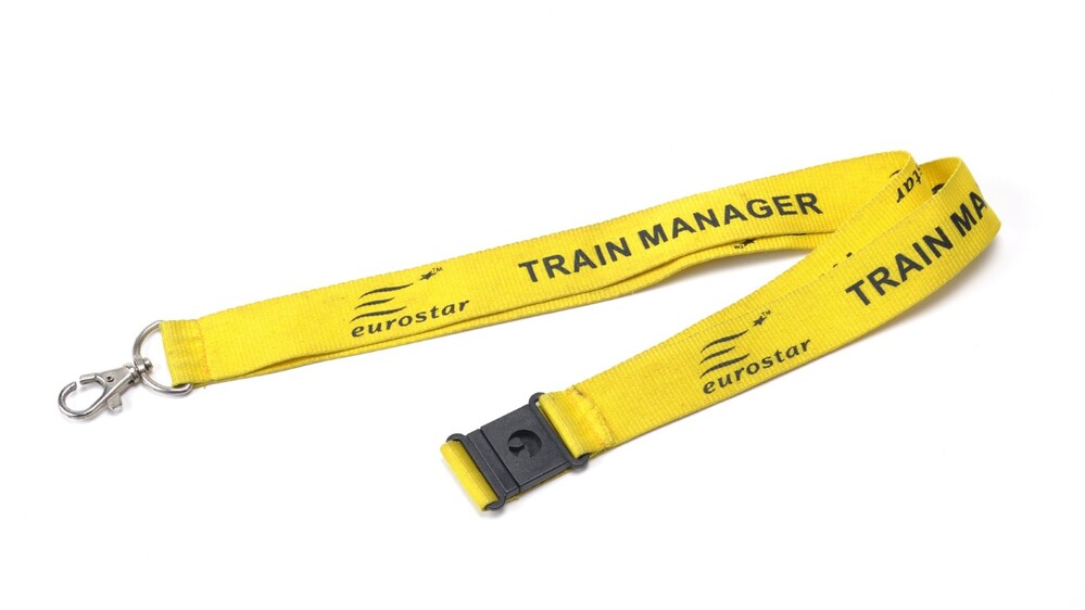 BeschrijvingGeel sleutelkoord met zwarte bedrukking: logo Eurostar + 'Train manager'. Onderaan is een metalen gesp om een sleutel of badge aan te hangen. Bovenaan een zwart slot.