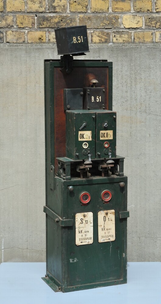 Dit is een elektromechanisch gedeelte van een seingestel dat nog steeds mechanisch bediend werd. Het groene kastje heeft twee ontvangers- en seinstiften. Bovenaan bevindt zich een bloktaster 'B.51' (knop die werd ingedrukt om de volgende seinpost te waarschuwen voor een aankomende trein). Op de voorkant staan twee reiswegplaatjes, met de opschriften 'S 13L HK B51 ← TRAAGSPOOR' en 'O1L HK B51 → TRAAGSPOOR', die de rijrichting van de trein aanduiden en welke stand de seinen en wissels moeten innemen bij de aanleg van een reisweg. We lezen ook de opschrifte 'OK 13l' en 'OK 01l'.