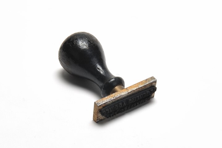 TitelMetalen stempel met houten handvat 'Receveur Arrivee Bruxelles-T.T.'