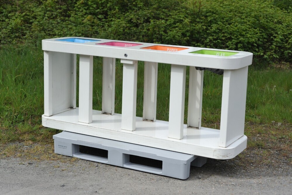 In deze witte houder konden vier zakken gehangen worden voor gesorteerde afvalinzameling. In het deksel zijn de vier openingen met een andere kleur aangegeven: groen voor 'glas', oranje voor 'papier', roze voor 'rest' en blauw voor 'PMD'. De opschriften zijn in witte letters. Het deksel kan met een sleutel losgemaakt worden en omhoog gekanteld worden om de vuilniszakken uit de houder te verwijderen.