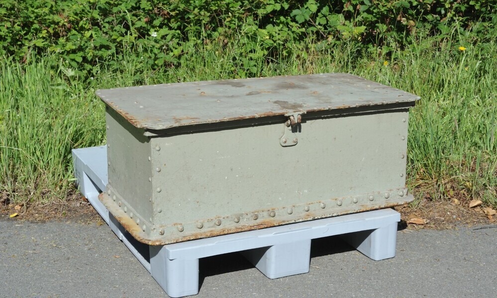 BeschrijvingDeze lichtgrijze kist werd vervaardigd met klinknagels. De kist kan geopend worden door een scharnierend deksel. Aan het deksel is een slot voorzien om die veilig af te sluiten.