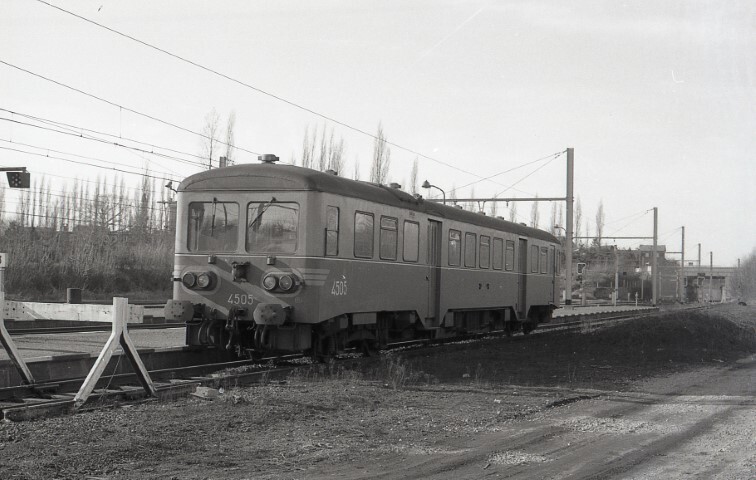 Deze motorwagen behoort tot de reeks 45. Hij staat opgesteld op een doodlopend spoor. Links zien we een stootjuk. Boven het stootjuk bemerken we een AVG (Aankondiger Verrichtingen Gedaan).