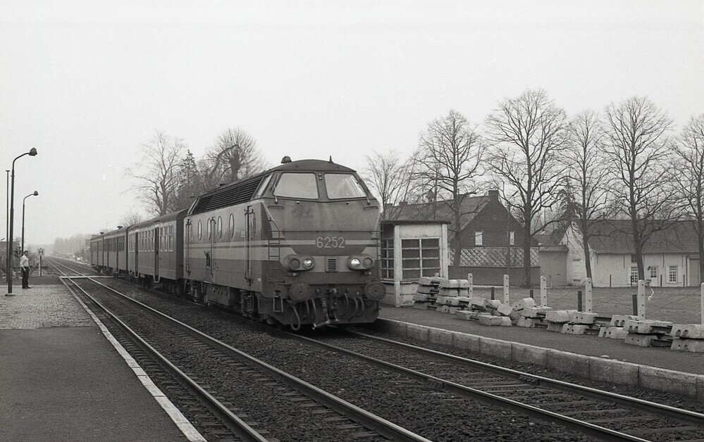 Deze locomotief behoort tot de reeks 62. Ze heeft M 2-rijtuigen aan de haak. Brede veiligheidsbanden sieren de donkere rijtuigkast van de locomotief. Rechts zien we een betonnen schuilhuisje. Op het rechtse perron liggen nieuwe betonnen dwarsliggers klaar om geplaatst te worden. Het linkse perron is met elektrische verlichtingspalen uitgerust. Aan het einde ervan zien we een bord met de letter 'H'. Dit bord geeft het einde van een perron aan. Schenking van Myriam Hendrickx.