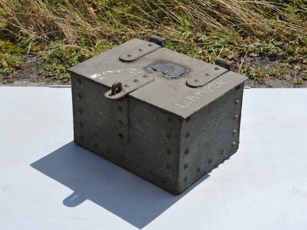 BeschrijvingMetalen kist met klinknagels. Op het deksel staat het opschrift 'lampen'.