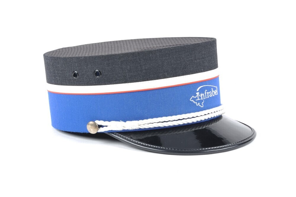 Deze kepie is blauw en donkergrijs met een zwarte klep in kunststof. Er loopt een witte bies op 4,5 cm boven de rand. Boven de klep is een dubbele witte stormkoord bevestigd met twee ronde metalen knopen. Vooraan is het logo van Infrabel geborduurd in witte draad. De kepie is verstevigd met een kunststoffen band en de voering is zwart. Schenking van Kristof Driessens.