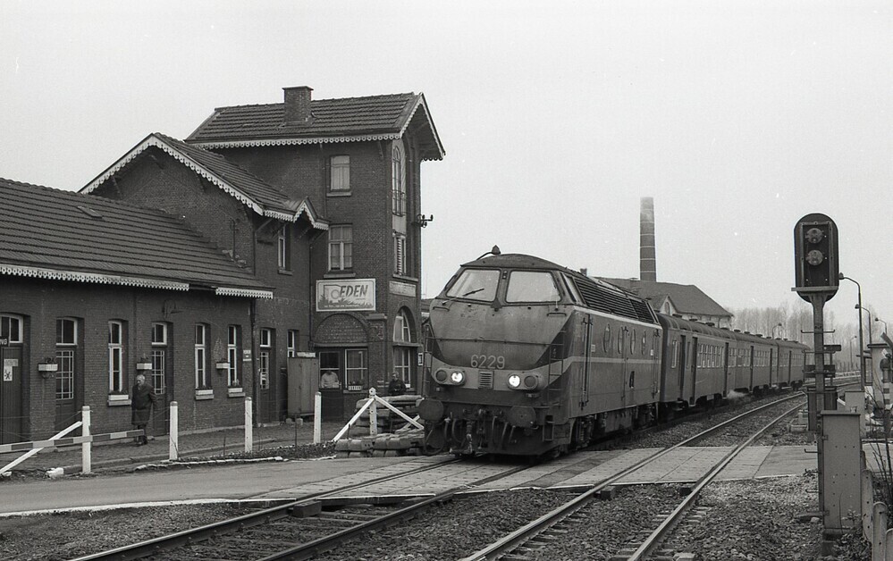 Deze locomotief behoort tot de reeks 62 en heeft M 2-rijtuigen aan de haak. Links zien we het stationsgebouw, op de voorgrond een overweg. Verder zien we rechts de achterzijde van een sein type I.
