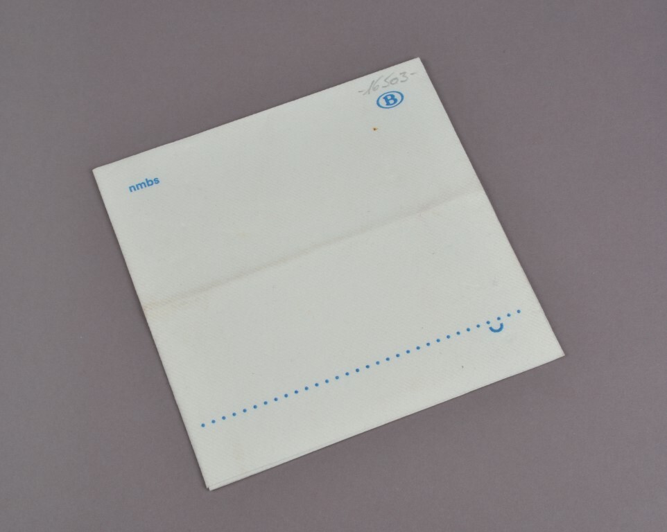 BeschrijvingWit servet met blauwe opdruk: links bovenaan 'nmbs', rechts bovenaan het logo van NMBS en onderaan een stippellijn met smiley.