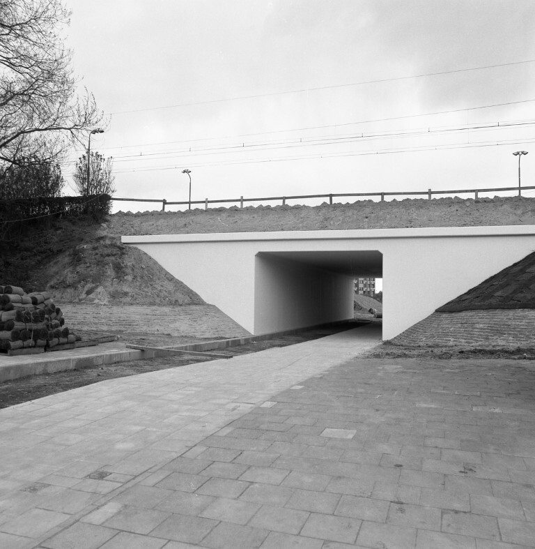 Deze fotogroep beval drie negatieven. Ze tonen de nieuw gebouwde onderdoorgang onder het station Heist. Dit station ligt een stuk hoger en de sporen zijn op een spoorberm aangelegd. De werken zijn nog niet volledig voltooid.