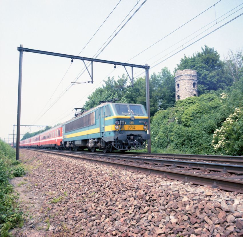 Deze fotogroep bestaat uit twee negatieven. Foto A toont locomotief 2714 met een sleep Eurofima-rijtuigen. De locomotief is blauw geschilderd met brede gele banden. Op foto B zien we motorstel 227 van de reeks 00, schijf 1963. Het motorstel is groen geschilderd met gele zichtbaarheidsstrepen. Beide treinen passeren een toren die tussen de stations van Neerwinden en Landen gelegen is.