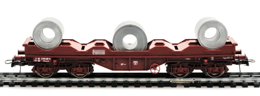 Bruine platte wagen van het type Shmmns voor het vervoer van metalen rollen. Dit type wagens werd in 1975-'78 gebouwd door La Brugeoise et Nivelles. De totale lengte is 12,04 meter en ze kunnen een totale last van 61,5 ton dragen. De maquette is op schaal H0 1/87 vervaardigd.