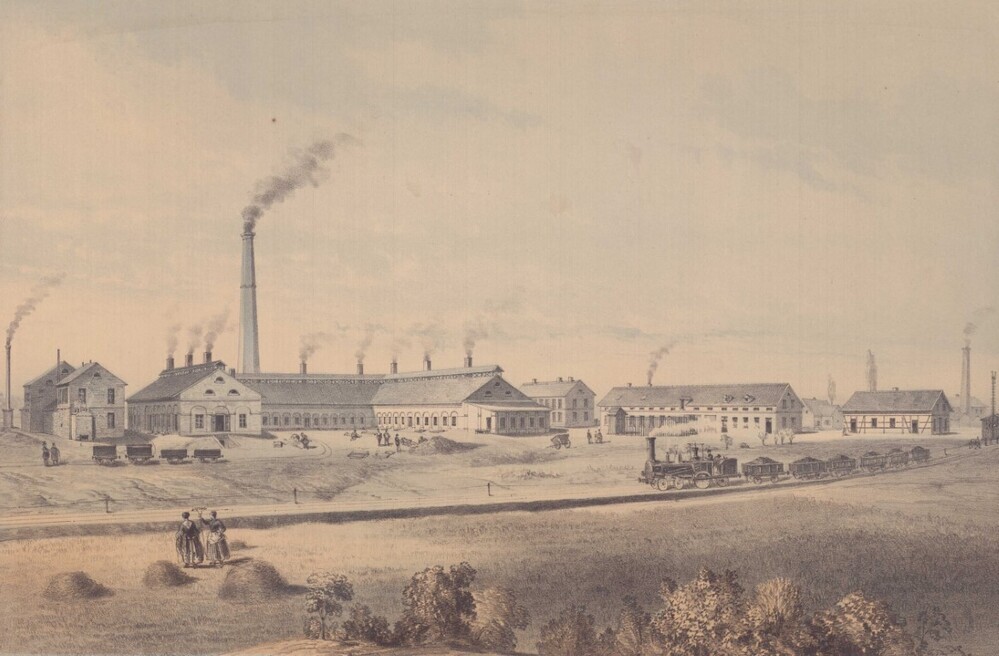 Gekleurde afbeelding van de fabrieksgebouwen van Borbeck. Op de voorgrond rijdt een stoomlocomotief met een sleep goederenwagens voorbij. Vooraan staan in het veld twee vrouwen naar de fabrieksgebouwen te kijken.