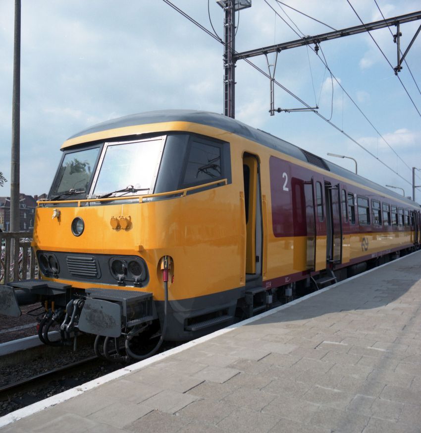 De fotogroep bestaat uit twee negatieven. De foto's tonen het nieuwe stuurstandrijtuig van de Nederlandse Spoorwegen (NS) voor de IC-verbinding Brussel - Amsterdam. Het rijtuig is geel en bordeaux geschilderd.