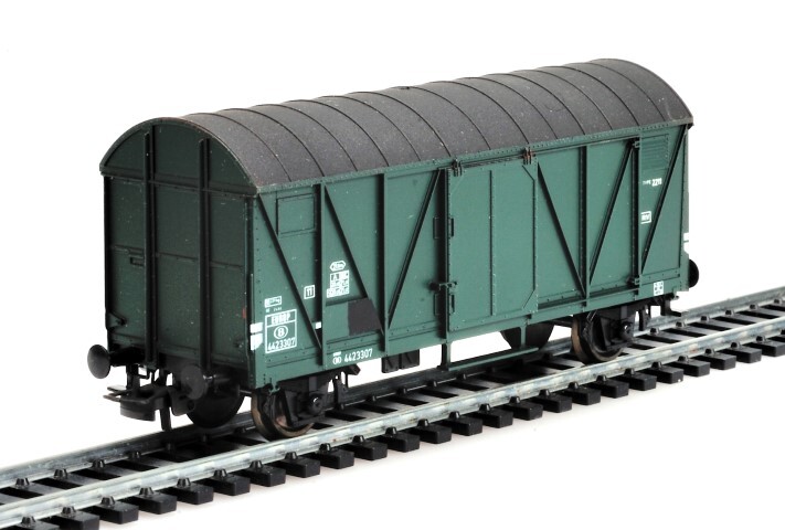 BeschrijvingGroene gesloten wagen van het type Gkklms uit 1947. Op de zijkanten staan verschillende opschriften, zoals het wagennummer. De maquette is op schaal H0 1/87 vervaardigd.