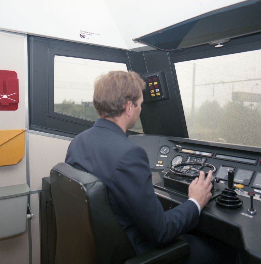 Deze fotogroep bestaat uit twee negatieven. De foto's tonen de stuurpost van een ICR-rijtuig (van de Nederlandse spoorwegen) dat dienstdoet op de verbinding Brussel - Amsterdam. Een machinist bedient de stuurtafel die met een snelheidskruk, hendels, meters en wijzerplaten is uitgerust.