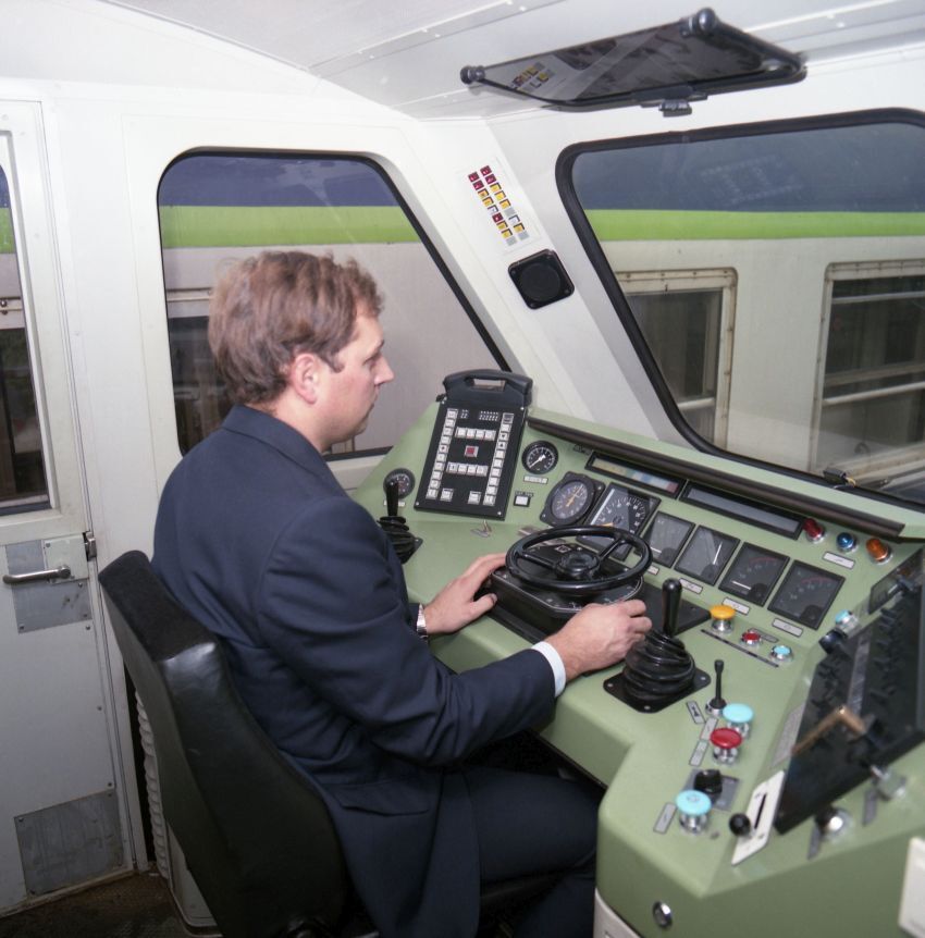 De foto toont de stuurpost van een elektrische locomotief reeks 11. Dit type werd in dienst gesteld in 1985-’86 en uit dienst genomen in 2012. De machinist zit aan een stuurtafel die met een snelheidskruk, meters, wijzerplaten, drukknoppen en handels is uitgerust.