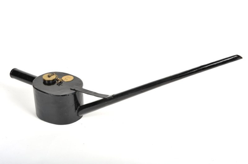 BeschrijvingDeze kan met tuit en handvat kan twee liter bevatten. Bovenaan bevindt zich een dekseltje dat met een ketting aan de kan is vastgemaakt. Dankzij de lange tuit kon men op moeilijk bereikbare plaatsen smeren.