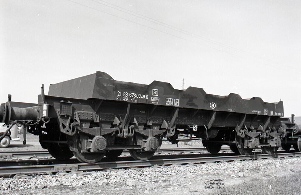 Deze fotogroep bevat twee negatieven. Op de foto's zien we een platte wagen op tweeassige draaistellen voor het vervoer van rollen plaatstaal. De vrij korte lengte van de wagen en de verzwaarde bodem laten toe zware lasten tot 20 ton te laden. De wagen draagt het UIC-nummer 21 88 676 0249-0 en behoort tot het type 1000B2.