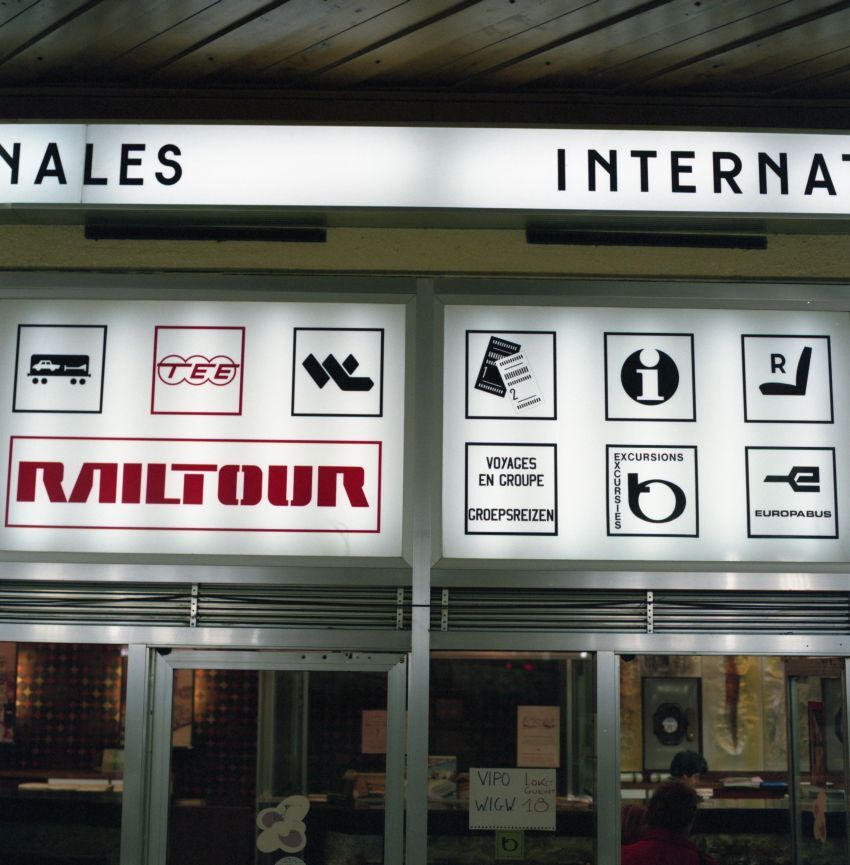 De fotogroep bestaat uit zeven negatieven. De foto's tonen pictogrammen in de wachtzaal van station Brussel-Zuid. We zien o.a. aanduidelingen voor het internationale loket waar tickets konden geboekt worden voor slaapwagens, TEE, CIWL, Railtour, Europabus, etc. Ander pictogrammen wijzen de weg naar het stationsbuffet, de bagagekluizen, de metro, etc.