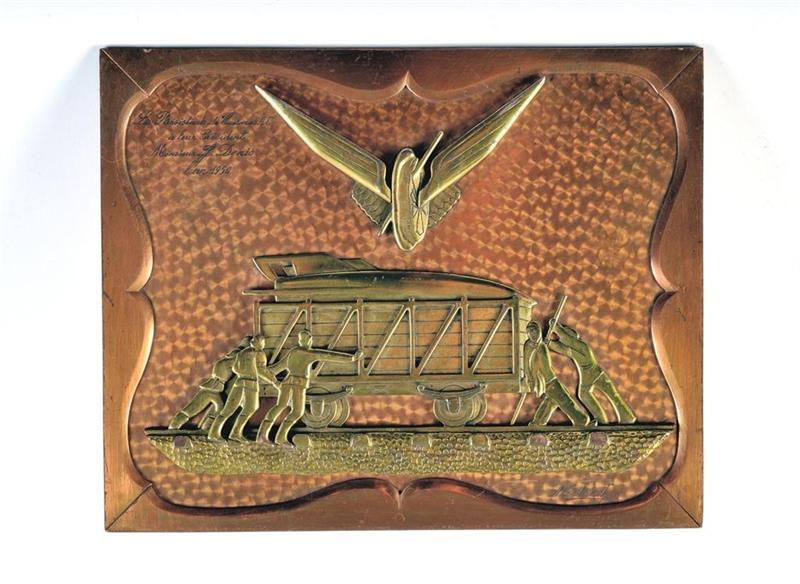 Plaat van koper en brons met een afbeelding van spoorwegmannen die een wagen met bommenwerper saboteren. Daarboven staat het gevleugeld wiel. Deze plaat werd in 1950 door de medewerkers van de Werkplaats aan hun voorzitter J. Denis geschonken.