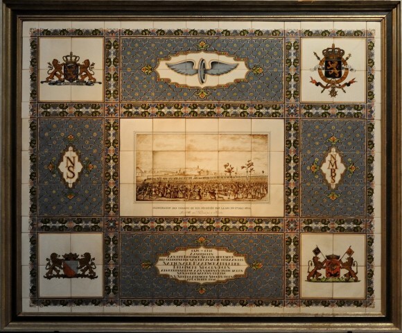 Plaat bestaande uit handbeschilderde tegels met verschillende taferelen. Centraal een afbeelding van de inhuldiging van de eerste spoorweglijn (Mechelen - Brussel) met daarboven het gevleugeld wiel. In de vier hoeken wapenschilden van het Nederlandse en Belgische koningshuis en de spoorwegmaatschappijen (NS en NMBS). Links staat het opschrift NS (Nederlandse Spoorwegen) en rechts NMBS. Onderaan staat '1926 - 1951 aangeboden aan het Belgische Spoorwegmuseum ter gelegenheid van het 25-jarig bestaan der Nationale Maatschappij der Belgische Spoorwegen als herinnering aan vijfentwintig jaren van goede samenwerking N.V. Nederlandsche Spoorwegen 22 oktober 1951'. Schenking van de Nederlandse Spoorwegen (NS).