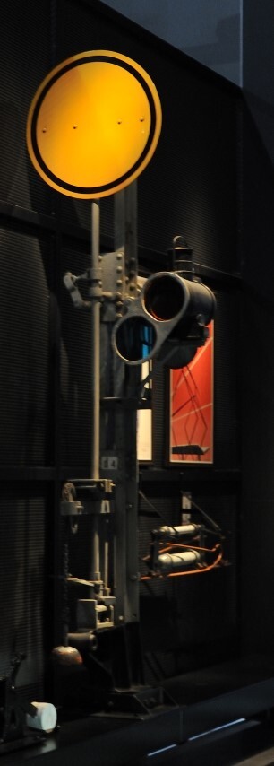 Seinpaal met bovenaan een gele schijf met een zwarte rand. Dit seinbord stond vooral op secundaire lijnen en kon in twee standen gezet worden. Haaks op het spoor wil zeggen dat het volgende stopsein op onveilig staat en dat de bestuurder tegen een verminderde snelheid moet doorrijden. Als de schijf evenwijdig met het spoor staat is gewoon doorrijden toegelaten. Onder de schijf is ook een lichtsein bevestigd om de seinen 's nachts te verduidelijken.
