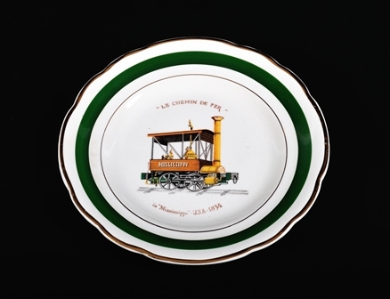 Klein wit bordje met groene rand en 2 gouden biezen met een afbeelding van de 'Mississippi'. Naast de afbeelding bevinden zich nog enkele opschriften: 'la "Mississippi"- USA- 1834' en '"Le chemin de fer"'. Dit bordje maakte deel uit van een Frans servies met als thema bekende locomotieven. De Mississippi was een Amerikaanse stoomlocomotief, gebouwd in 1834.