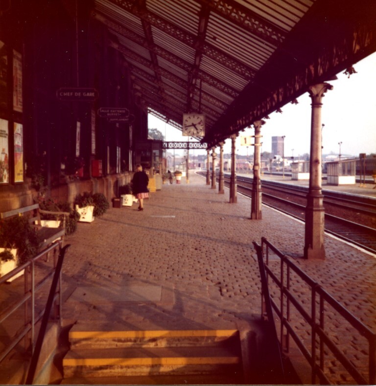 De foto toont perron 1 van station Aat. Het perron is overdekt door een luifel, waaraan een stationsklok hangt. Links zijn enkele affiches en informatieborden te zien. In de voorgrond leiden trappen naar een onderdoorgang om de andere perrons te bereiken. Schenking van Hugo De Bot.