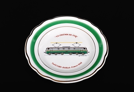 Klein wit bordje met groene rand en 2 gouden biezen met een afbeelding van de CC 7107. Naast de afbeelding bevinden zich nog enkele opschriften: 'la CC 7107 - 331 Kmh- France- 1952' en '"Le chemin de fer"'. Dit bordje maakte deel uit van een Frans servies met als thema bekende locomotieven. De CC 7107 was een Franse elektrische locomotief, gebouwd in 1952. Op 28 maart 1955 werd zij beroemd toen ze het wereldsnelheidsrecord op rails vestigde met een snelheid van 331 km/u. Dit record staat op naam van twee locomotieven: de BB 9004 en de CC 7107, beide van de SNCF.
