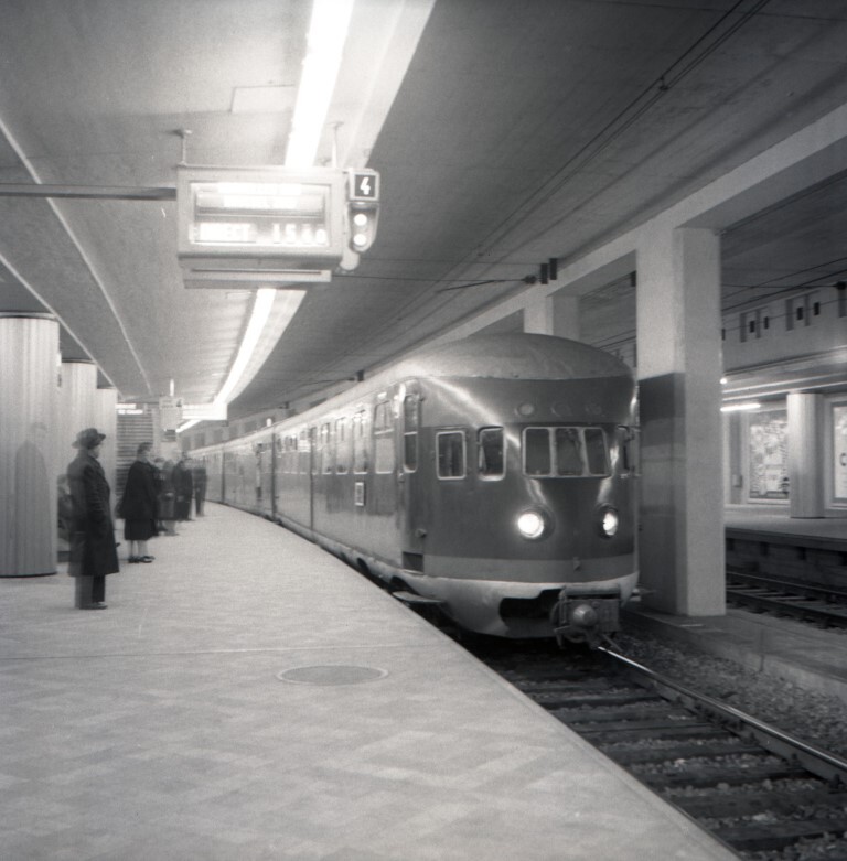 De fotogroep bestaat uit vijf negatieven. De foto's tonen de aankomst van een dieselmotorwagen DE3 van de Nederlandse Spoorwegen (NS) op spoor 4. Aan het plafond hangt een mechanische treinaankondiger. Reizigers verlaten de trein. De machinist poseert naast de stuurpost van het treinstel.