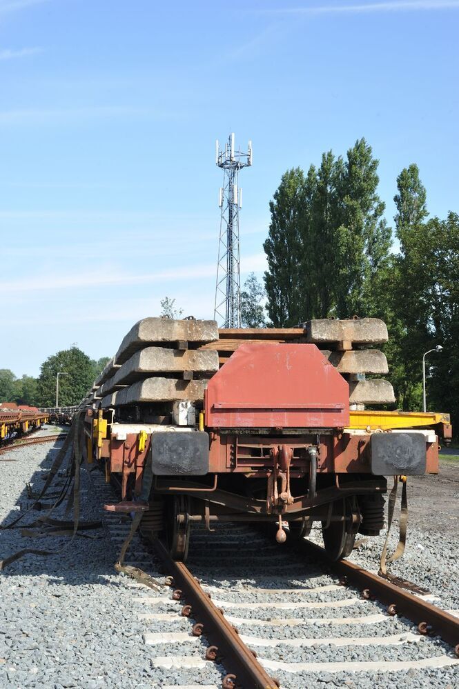 BeschrijvingDeze groep bevat zes digitale foto's. Ze tonen een werktrein beladen met betonnen dwarsliggers bij Steenbrugge.