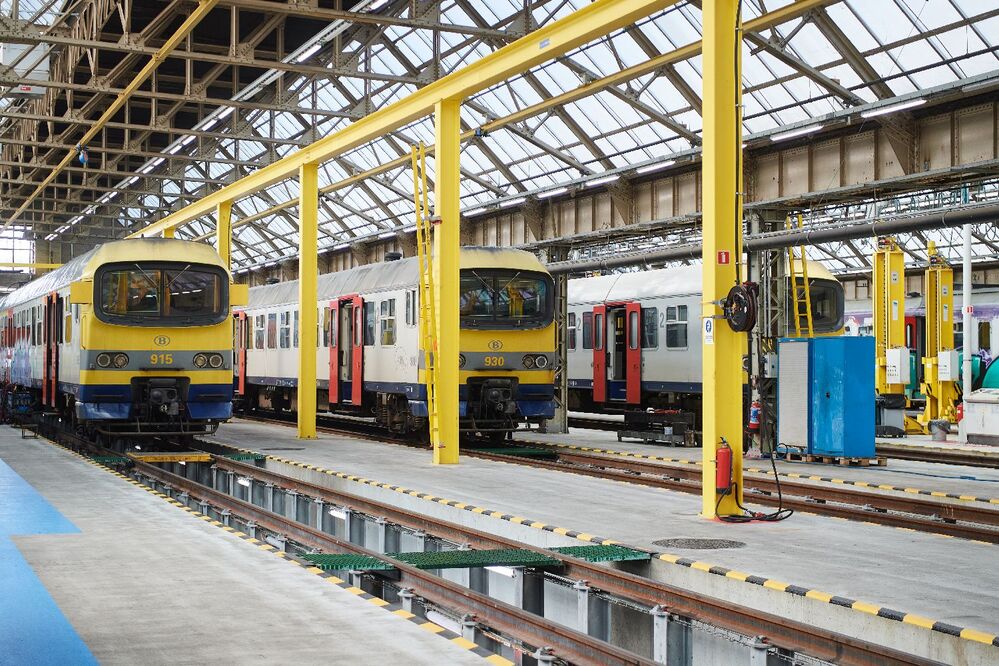 Deze groep foto's bestaat uit 102 digitale foto's. Ze tonen verschillende binnenzichten van de tractiewerkplaats (AT) in Schaarbeek. Medewerkers voeren onderhoudswerkzaamheden uit aan draaistellen, rijtuigen en motorwagens. Boven de schouwputten staan motorstellen reeks 09 ‘Sprinter’ opgesteld. Technici dragen blauwe of gele overalls.