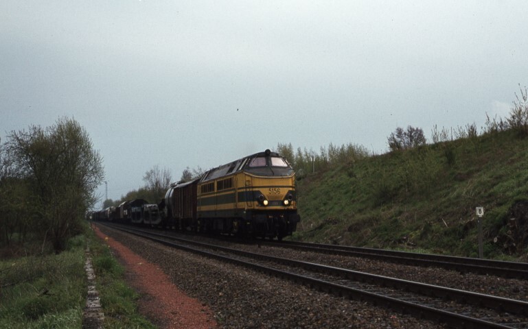 Deze fotogroep bevat twee dia's. Op het eerste beeld zien we een lange goederentrein gesleept door diesellocomotief 5154 (reeks 51). Op de volgende foto is dezelfde locomotief te zien tijdens een losse rit op volle baan. Schenking van Myriam Hendrickx.