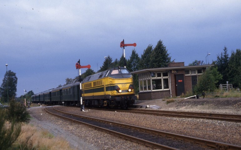 Deze fotogroep bevat vijf dia's. Een diesellocomotief reeks 51 sleept een reizigerstrein samengesteld uit K 1- rijtuigen. De locomotief is geel geschilderd met brede groene banden. Op de eerste foto is de voormalige seinpost te zien. De andere opnames werden gemaakt op volle baan. Naast de sporen staan mechanische seinen van de Nederlandse spoorwegen. Schenking van Myriam Hendrickx.