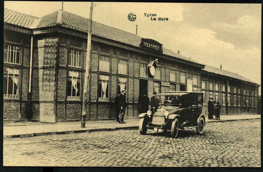 Reproductie van een postkaart met het opschrift 'Ypres La Gare'. De foto toont het station met tweetalig naambord en stationsklok. Het gebouw werd na de Eerste Wereldoorlog opgetrokken uit metselwerk tussen vakwerk in metaal. Op het trottoir staan voorbijgangers. Een chauffeur heeft zijn auto voor het station geparkeerd.