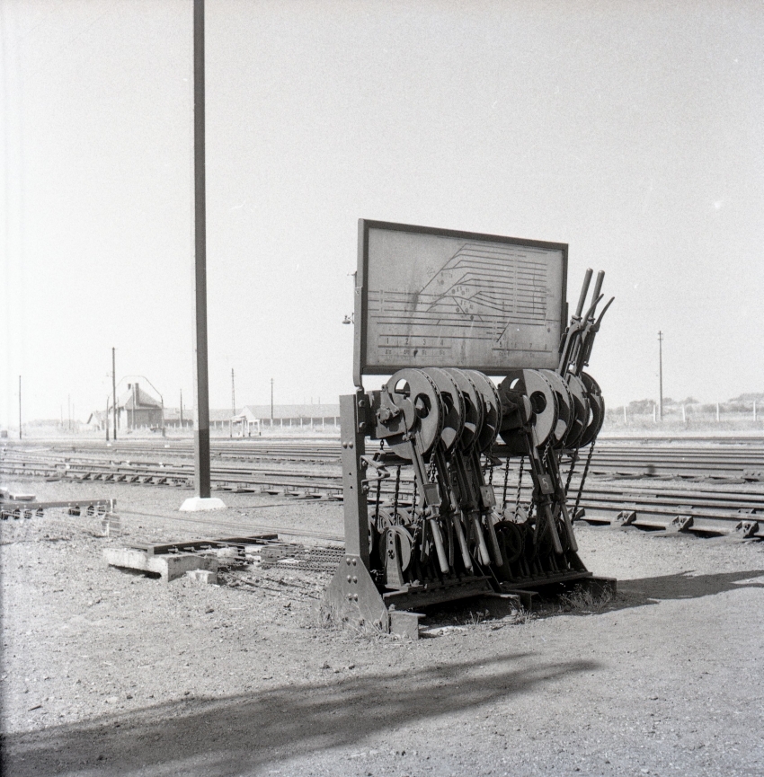 Deze foto toont een seinpost in open lucht van de mechanische seininrichting. Aan de inrit van een rangeerbundel werd meestal de bediening van de wissels gecentraliseerd, zoals hier in het vormingsstation van Adinkerke. Boven zien we een bord met de schematische voorstelling van de sporenbundel. Daaronder bevinden zich de bedieningshandels van de wissels. Achter deze installatie bemerken we het geleidingssysteem voor de trekdaden die de verbinding maken met de wissels.