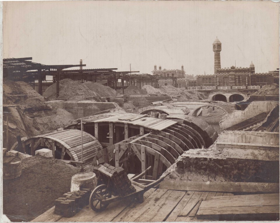 De foto toont de heropbouw van de onderdoorgang na beschadiging tijdens de Eerste Wereldoorlog. Links zien we de metalen luifels van de perrons en in de achtergrond het stationsgebouw met uurwerktoren.