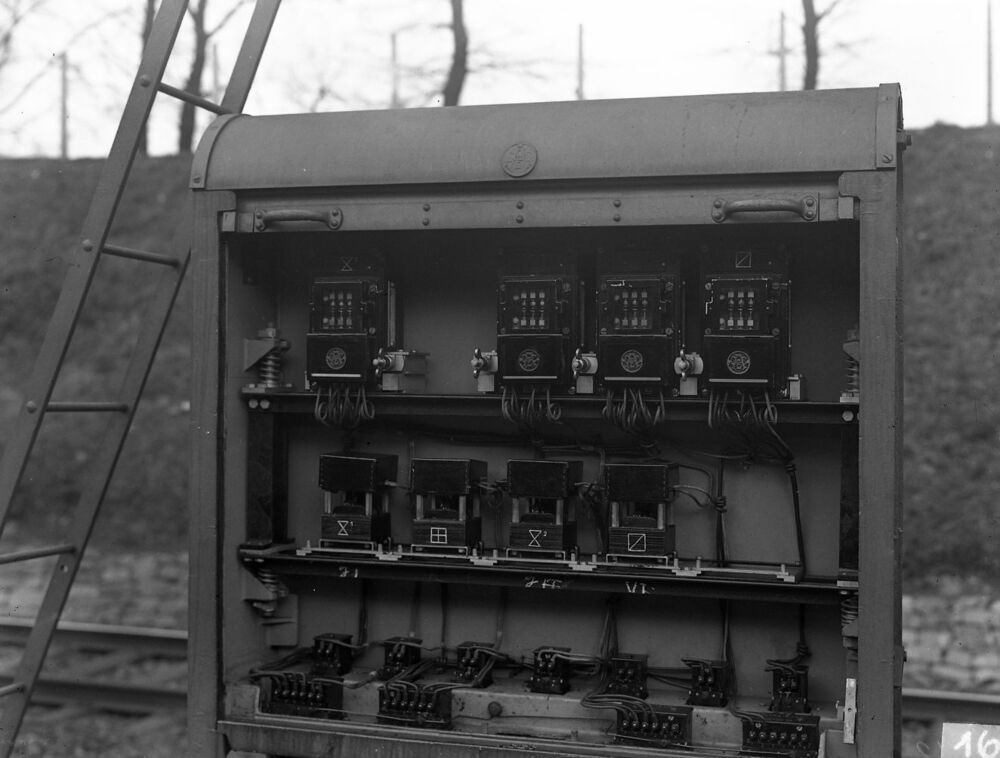 BeschrijvingDe foto toont een verdeelkast voor de voeding van de seinen van het lichtseinstelsel. Op de toestellen is het embleem van de firma ACEC te zien.